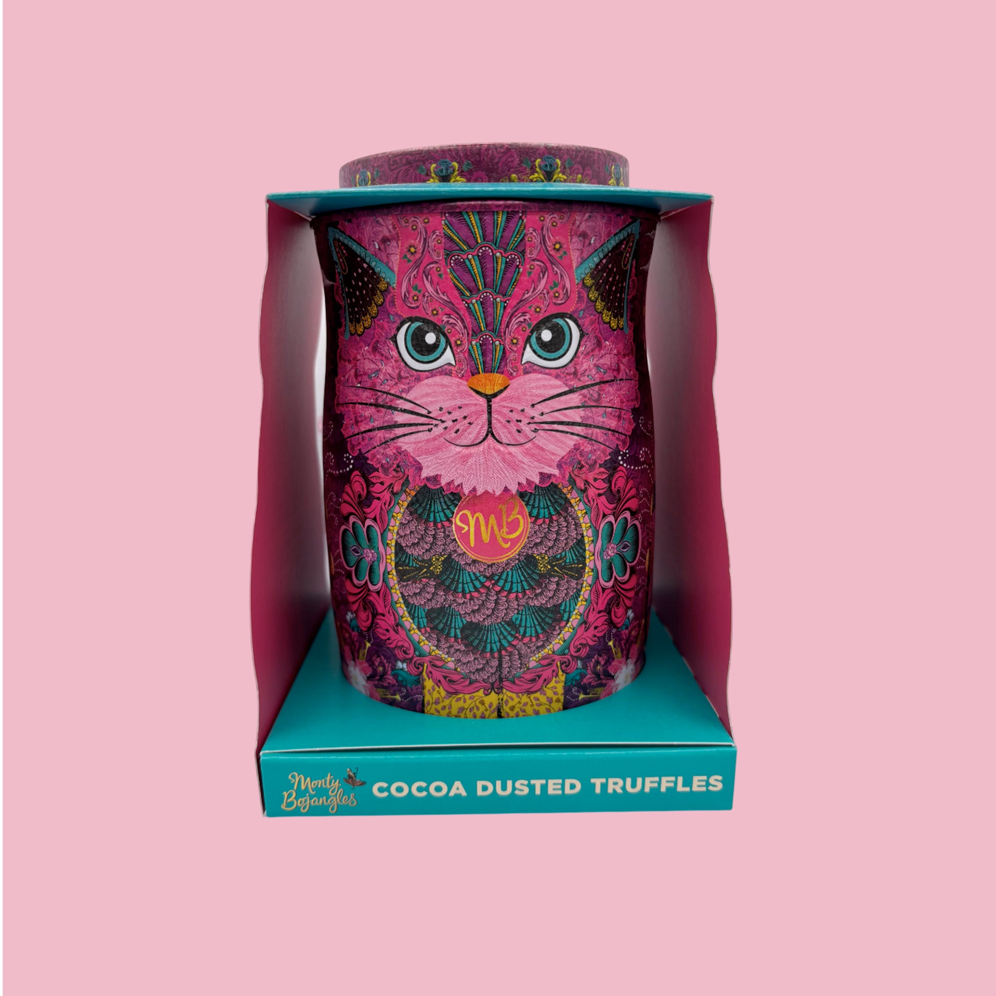 Award Winning truffles! Persian Pink Cat tin contains Choccy Scoffy Coco Dusted truffles. Beautiful pink tin with touches of blue in this design. The tin can be collected and reused and is popular with cat and animal lovers.