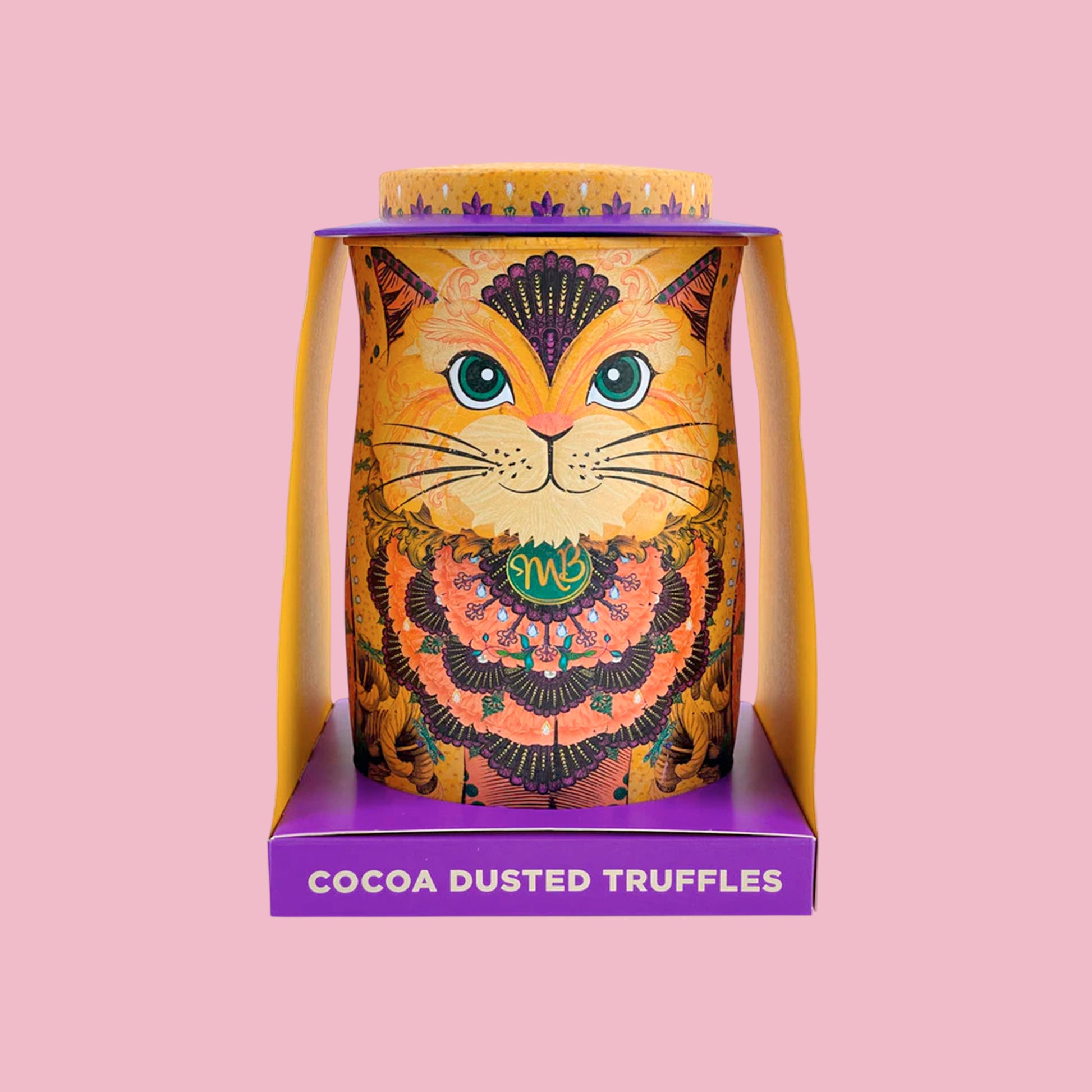 Gold, oranges with purple highlights make this stunning Savanna Gold collectable and reusable cat tin a perfect present. The cat tin contains soft and delicious Flutter Scotch Cocoa Dusted Luxury Truffles.