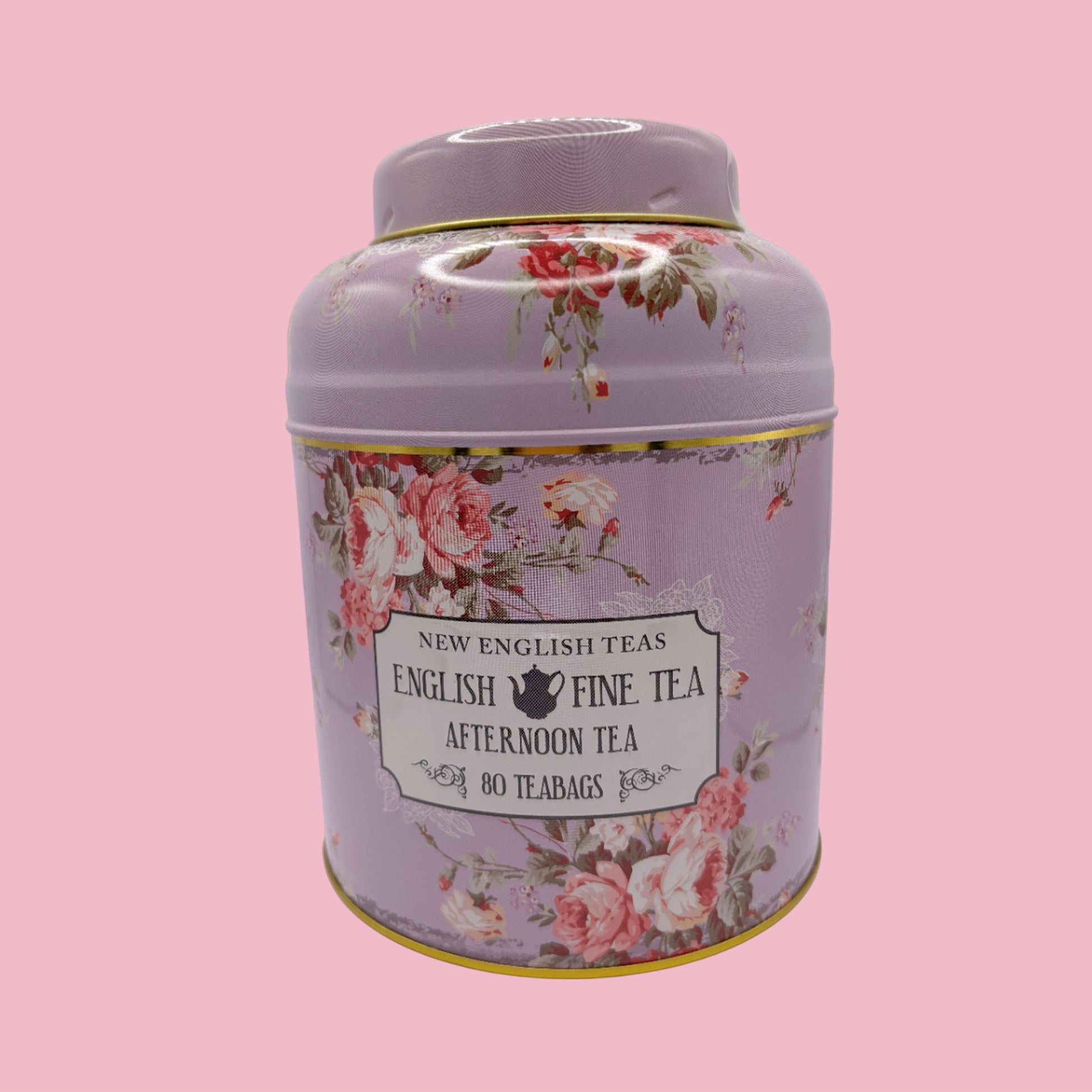 Very Pretty Victorian Floral (roses) English tea tin in a pink and lavender colour theme with images of roses and contains 80 tea bags.